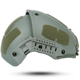 - Caractéristiques : Support métallique à l'avant du casque pour lunettes de vision nocturne, rails tactiques latéraux pour accessoires, velcro, neuf coussinets anti-impact
