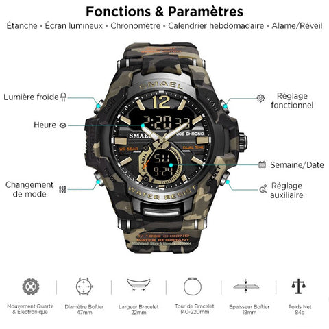 La Montre Camouflage est un instrument de guerre arborant des motifs militaires. Résistante et robuste, elle comporte de nombreuses fonctionnalités !